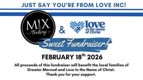 Save The Date! Wednesday Feb. 18th Buy a treat from Mix Bakery on February 18th and all proceeds will benefit local families of Greater Merced and Love INC. For more info pick up a flyer during